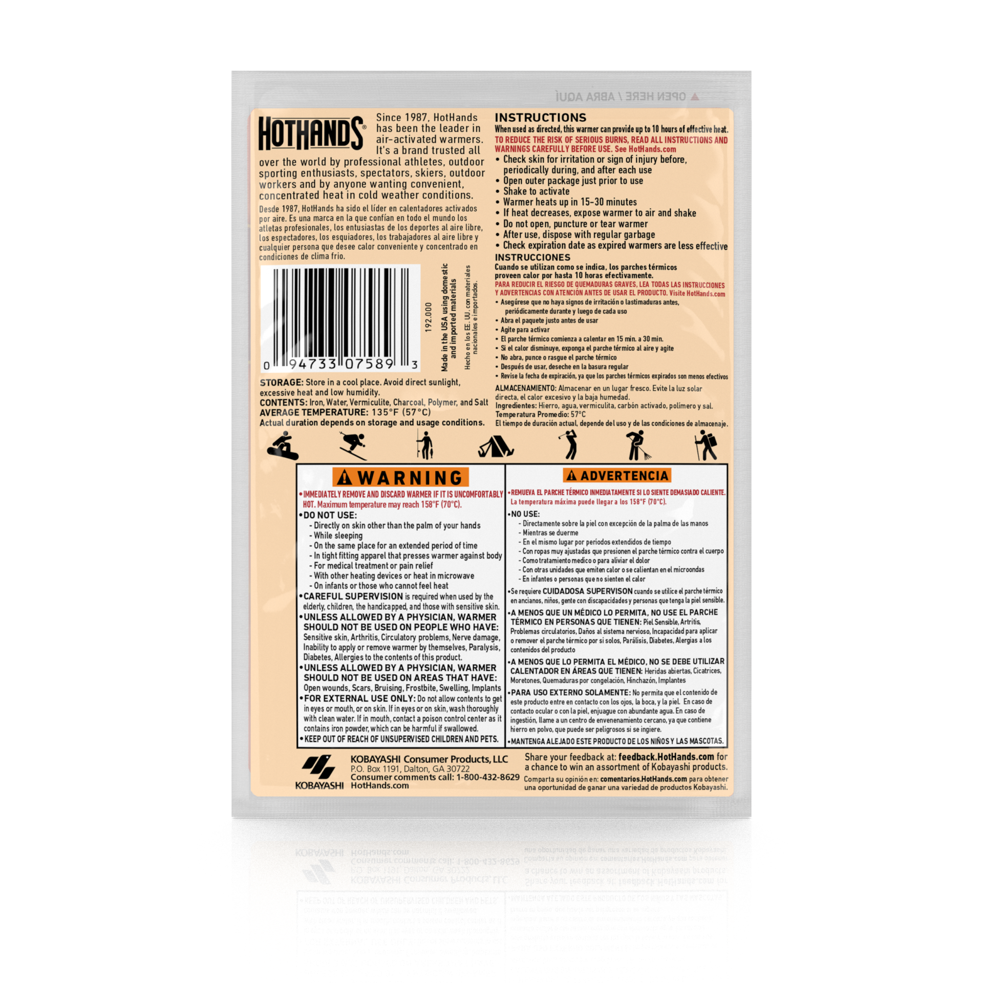 Rectangular shaped single-use air-activated heat packs that contain and adhesive on one side so they stay in place where you stick them. They provide up to 12 hours of continuous warmth for the body.