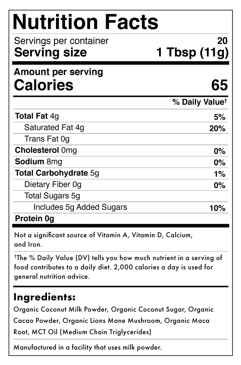 Ingredients • Coconut milk powder • Coconut sugar • Cacao powder • Maca powder • Chaga mushroom powder • Lions mane mushroom powder • MCT Dietary Info • Naturally Gluten-Free • Vegan • Dairy-Free • Keto-Friendly