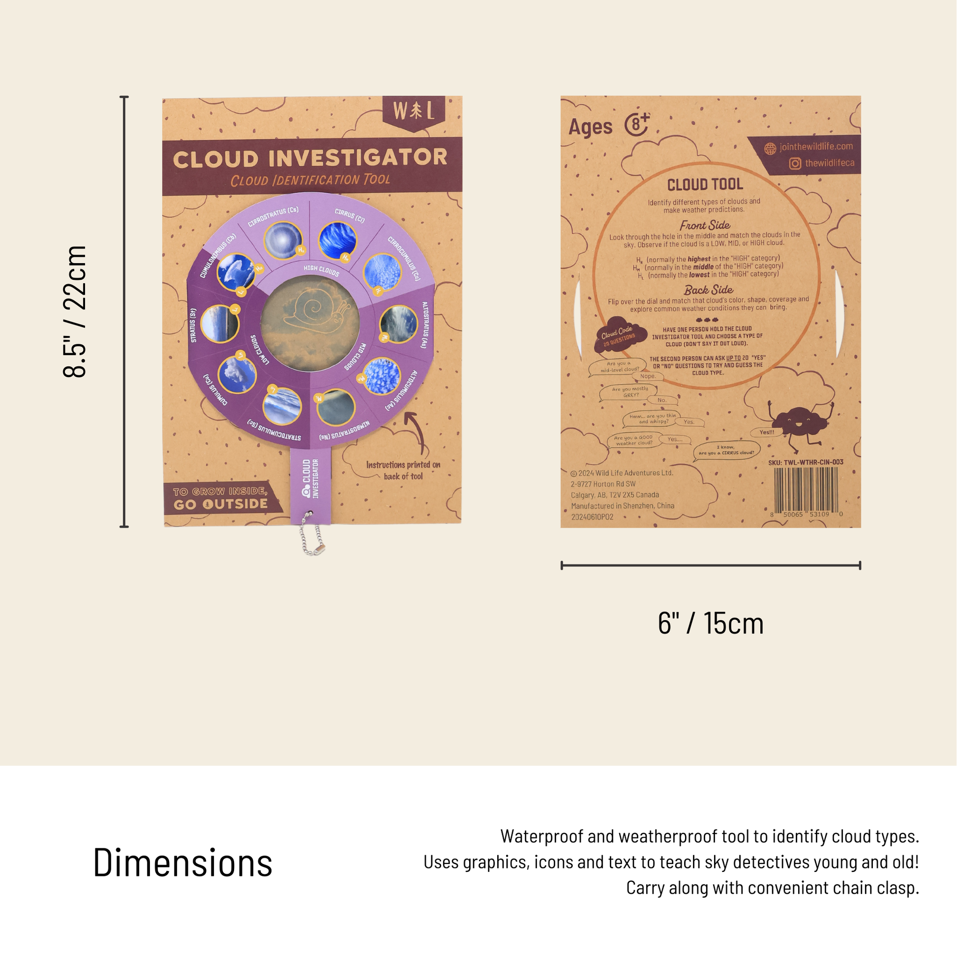Using the Cloud Investigator is simple and fun—hold it at arm’s length, look through the observation hole, and match the clouds in the sky to the images printed on the tool. Whether you’re planning a hike, teaching kids about weather patterns, or just curious about the skies, this tool makes cloud identification engaging and accessible. A perfect way to add an exciting layer of exploration to our outdoor experiences.