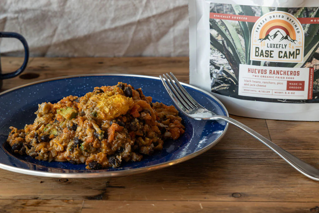 Two organic corn tortillas, two organic fried eggs, organic black beans, organic ranchero salsa, avocados, pico de gallo salsa and a cute little side of Tapatio salsa! This is a very hearty breakfast for 1 or a perfect way to start a day on the trail for two along with a small fruit.