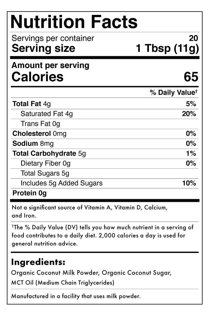 Ingredients • Coconut milk powder • Coconut sugar • MCT Dietary Info • Naturally Gluten-Free • Vegan • Dairy-Free • Keto-Friendly